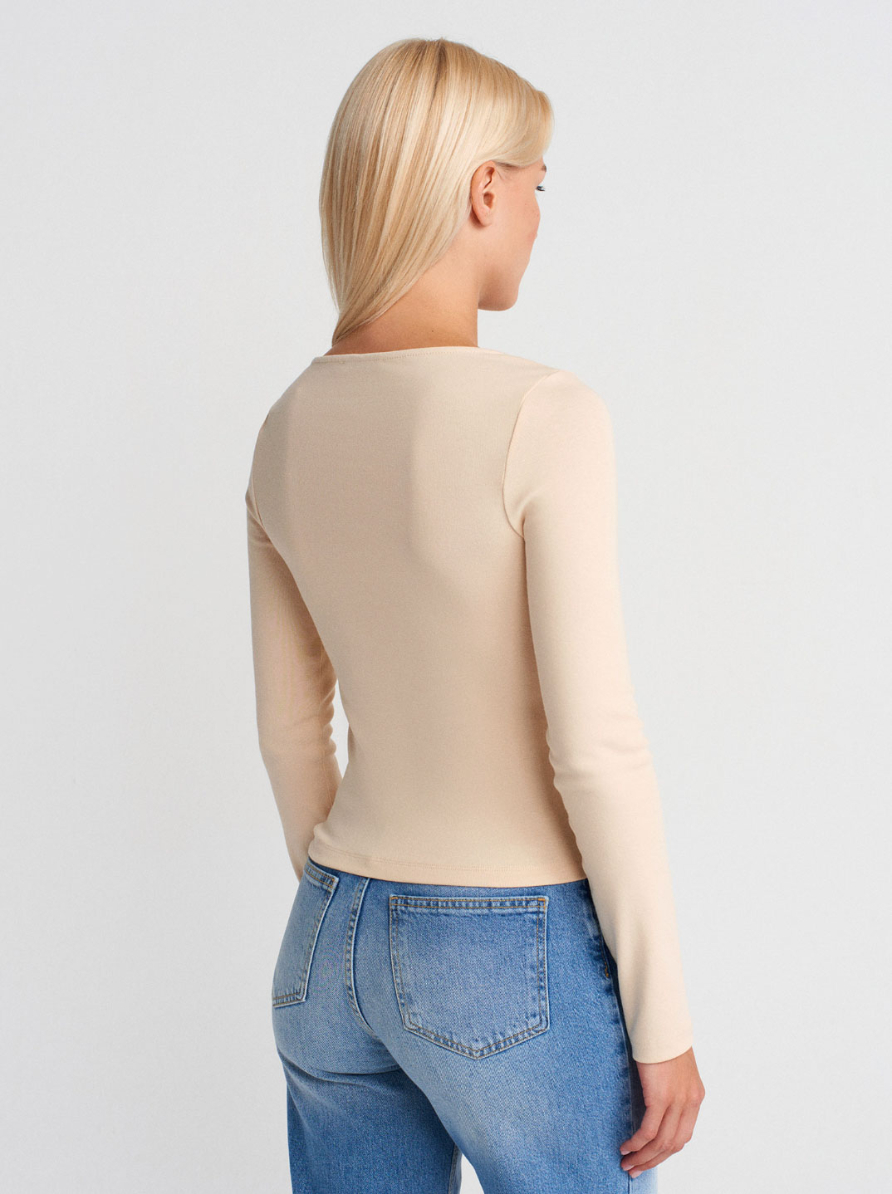 Dik Yaka Uzun Kollu Top Ekru Bluz