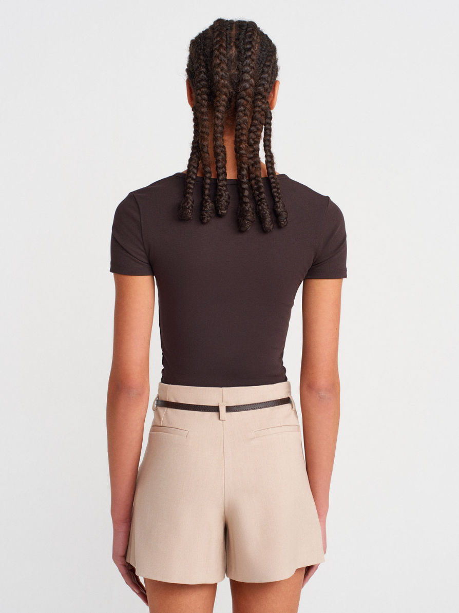 ÇITÇIT DÜĞMELİ KISA KOLLU KOYU KAHVE TOP TİŞÖRT
