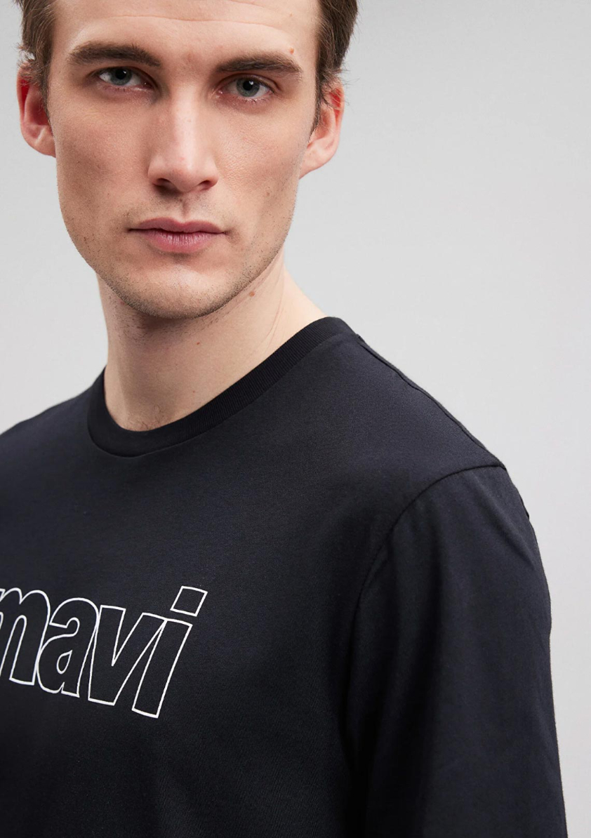 Siyah Mavi Logo Baskılı Pamuk Tişört