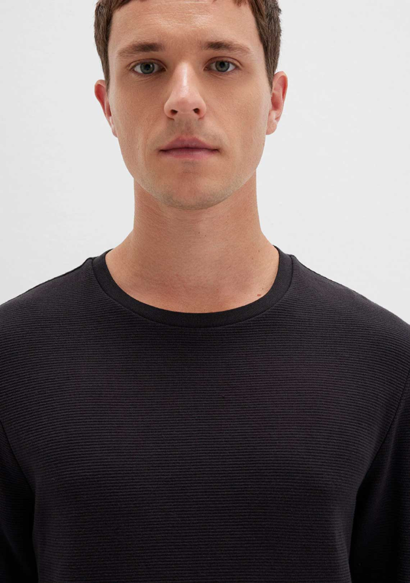 Uzun Kollu Dokulu Siyah Tişört, yüzde yüz pamuklu orta ağırlıkta kumaştan üretilmiştir. Slim fit, dar kesim özelliği ve uzun kolları ile şık bir görünüm sunarken, bisiklet yakası klasik bir tarz katar. Düz dokulu yapısı ve siyah rengi ile her kombine uyum sağlayan bu tişört, günlük kullanım için ideal bir seçenektir.